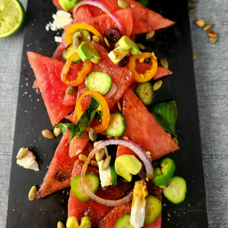 Variations of this salad are found throughout Africa and the Mediterranean. The recipes range from simple (watermelon, feta and mint) to complicated with nuts, more fruit, onions, olives, chiles, fancy vinaigrettes and tangy syrups. Cucumbers are especially common in this dish and I’m partial to the Persian ones because they can be chopped whole, whereas…