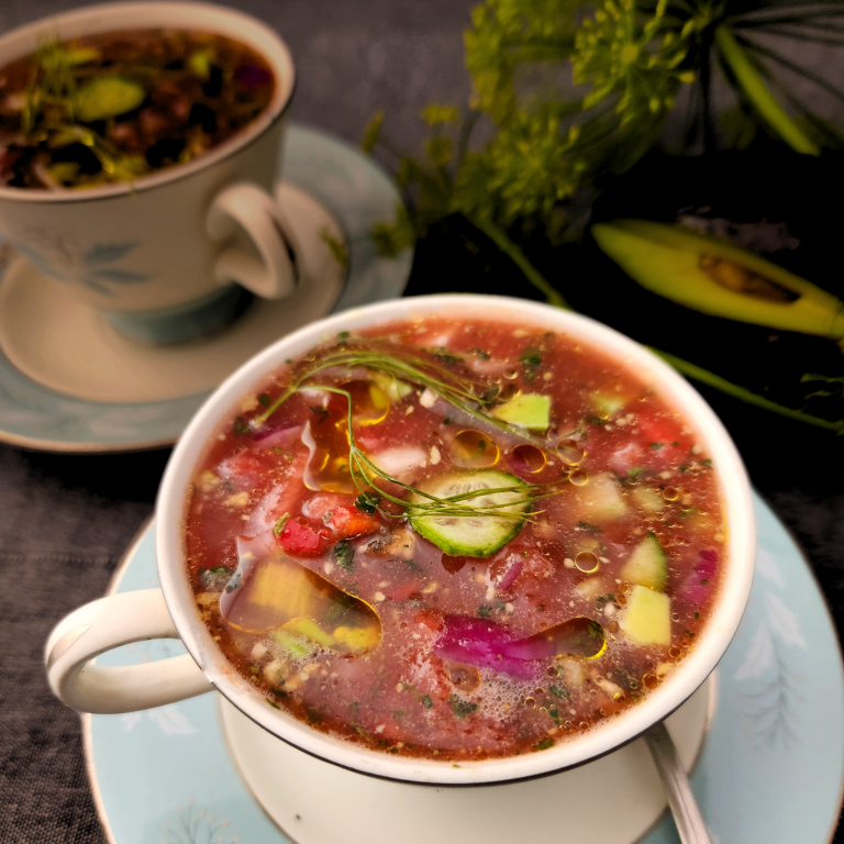 Gazpacho done this way is a three step process; dice the vegetables using half of your watermelon, make a pesto from the herbs and juice the other half of the watermelon. Don’t be afraid to use a heavy hand with the spices. The savory along with the sweet makes an addictive combination. It is easy…